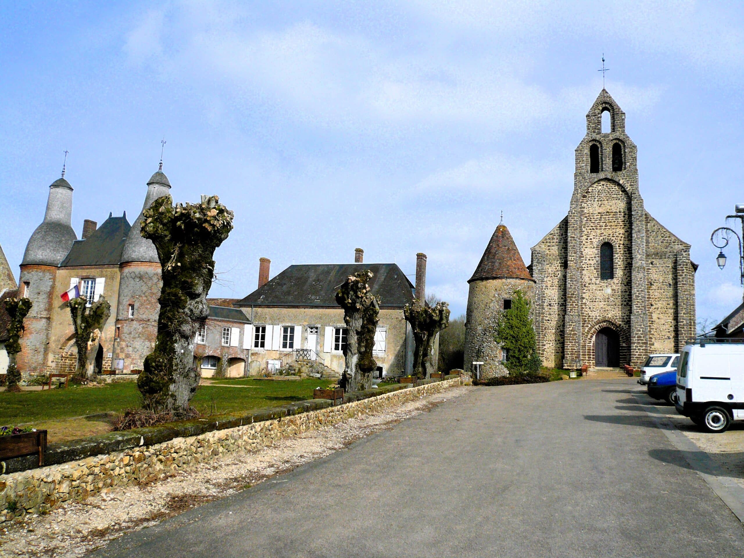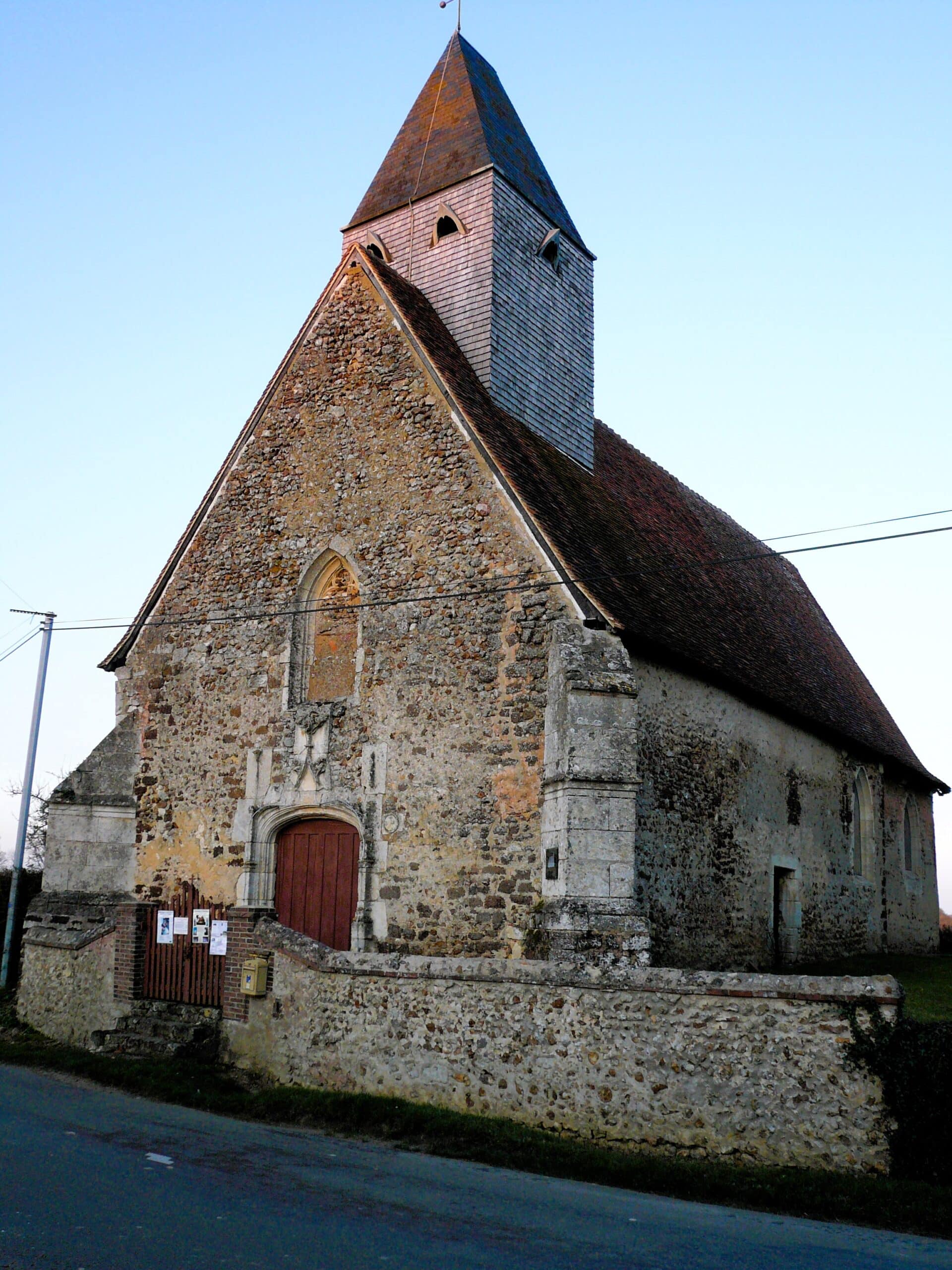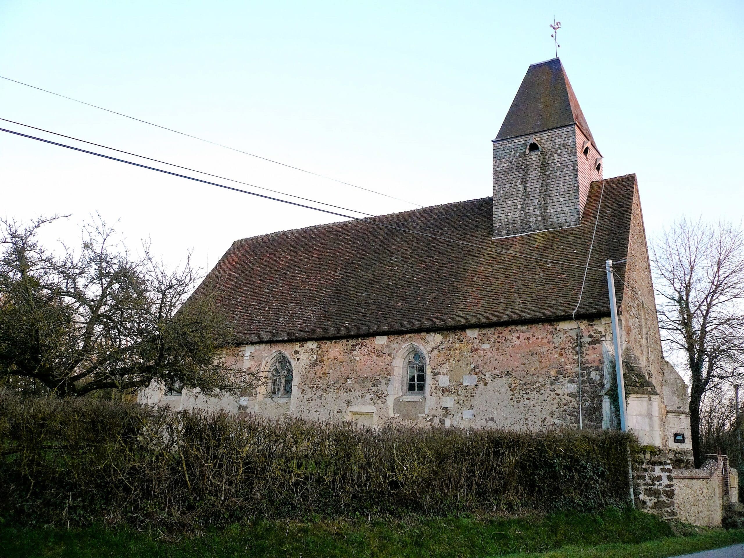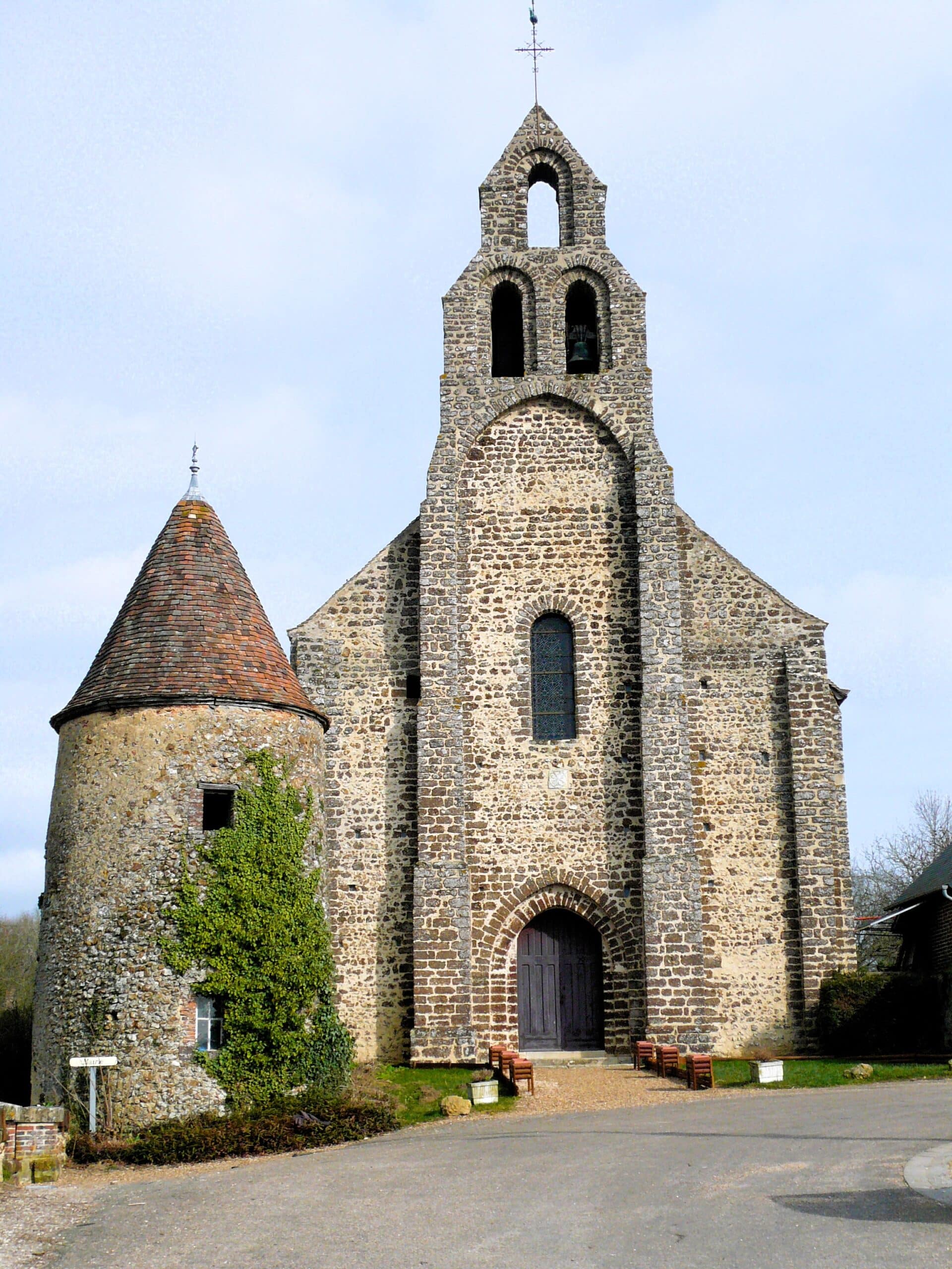 Sans doute la plus ancienne des églises du Perche ! Située en pleine campagne, près d’une mare et d’un tout petit cimetière, cette église romane du XIème siècle symbolise bien les paysages du Perche. L’édifice a été construit en 1059 par l’Abbaye Saint-Père de Chartres sur les ruines d’une église plus ancienne. La charpente de la voute en forme de vaisseau renversé date du XVème siècle, ainsi que les peintures murales, dont l’une représente « le dit des trois vifs et des trois morts ». Elle renferme également une magnifique collection de 14 statues en bois polychromes du XVIème siècle. Le mobilier est du XVIIème siècle. Le portail renaissance et le clocher en bardeaux (tuiles en bois) méritent le détour.