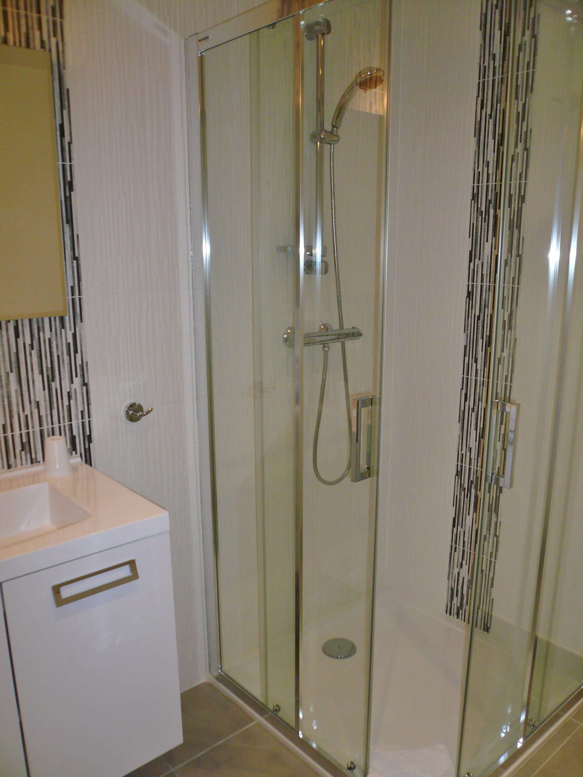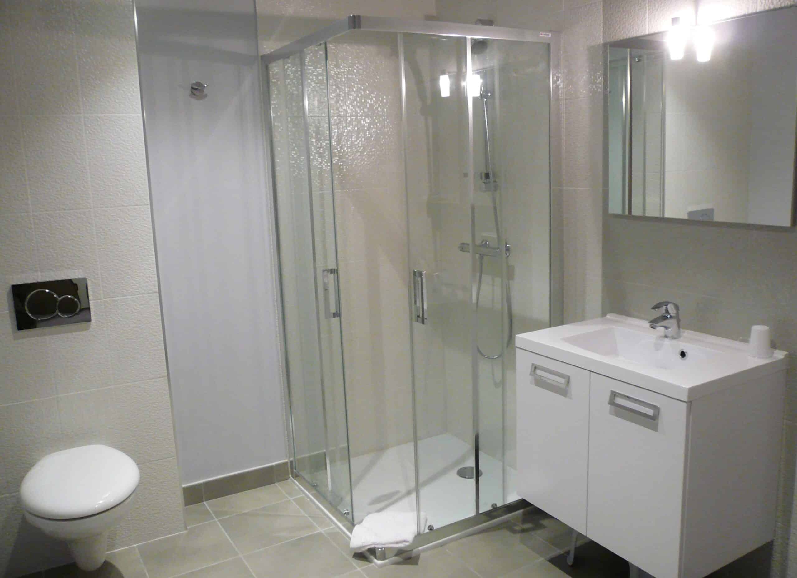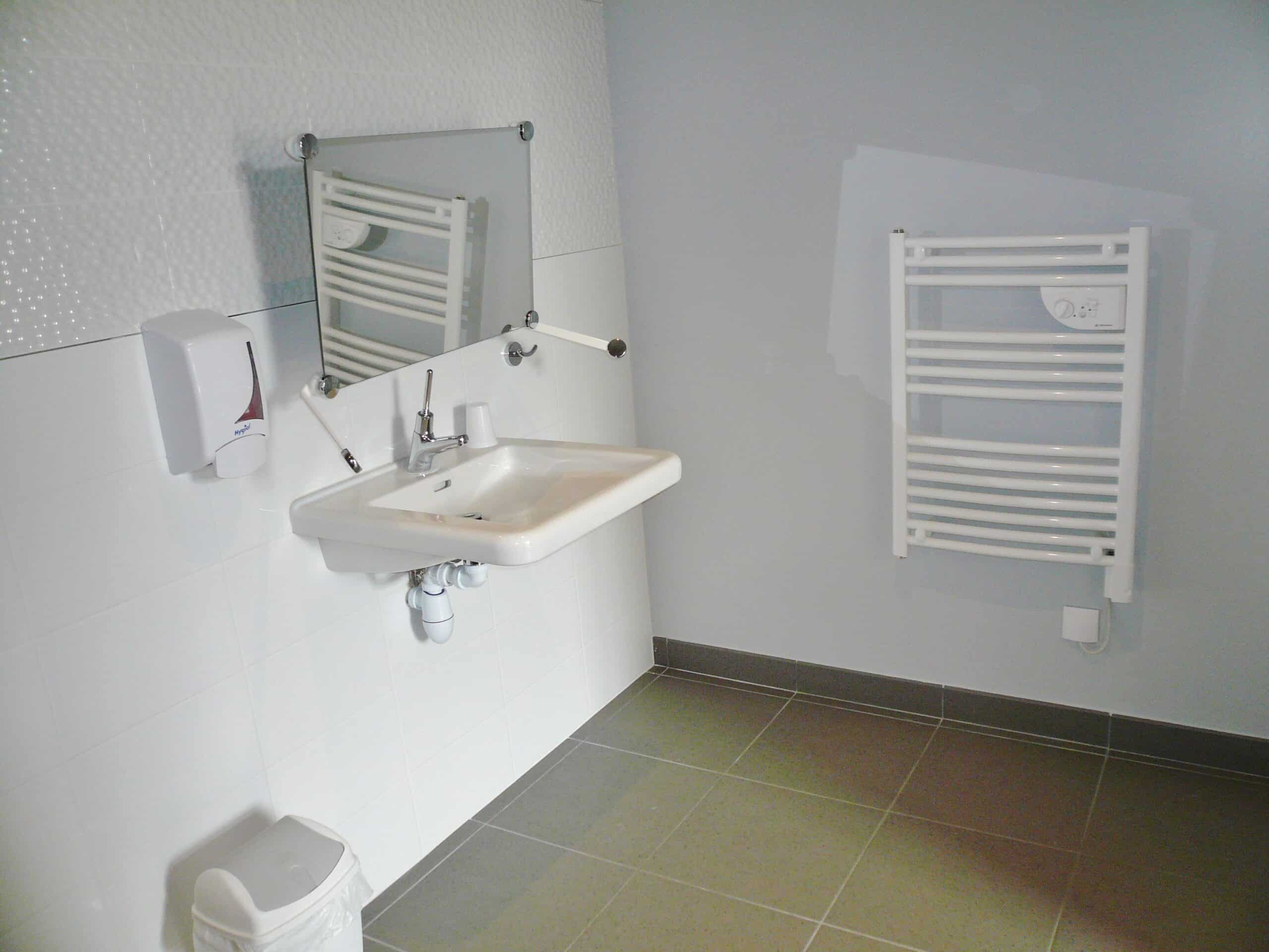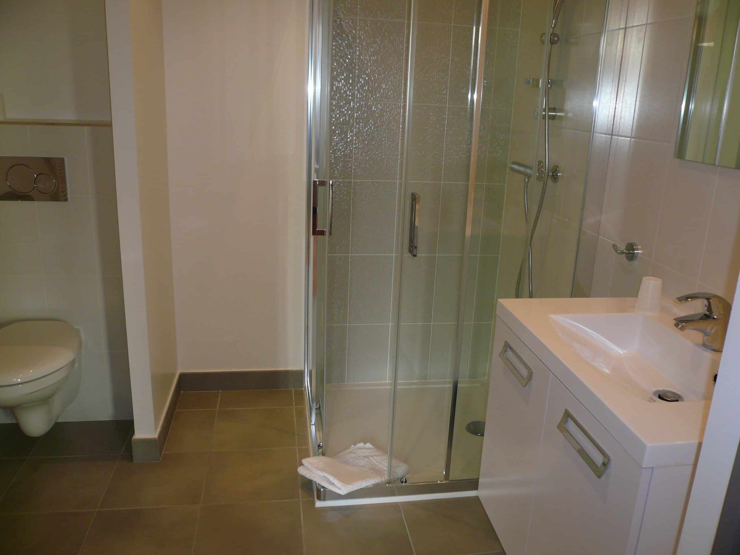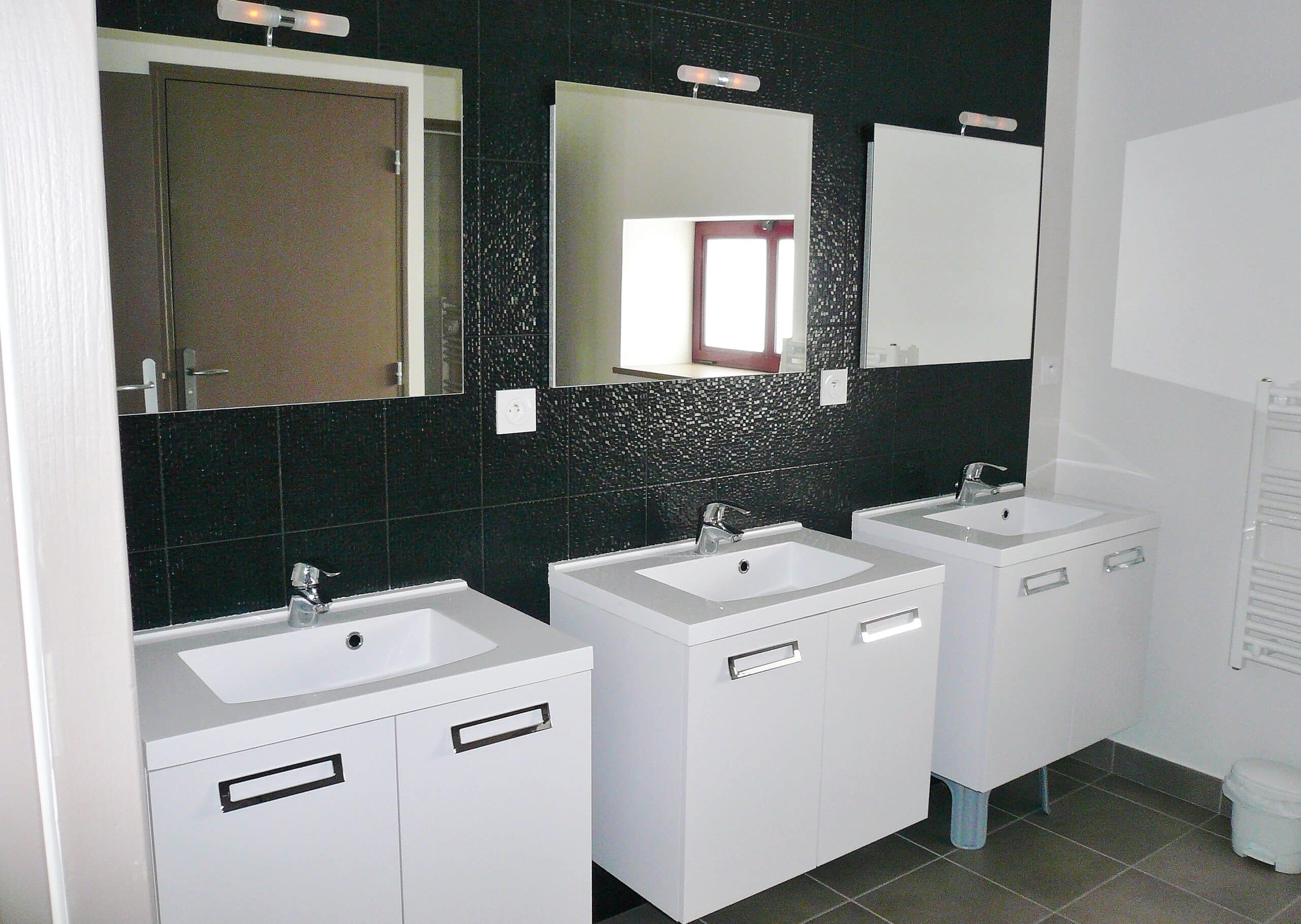 La salle de bain offre 2 douches et 3 lavabos incluant des radiateurs sèche-serviettes.