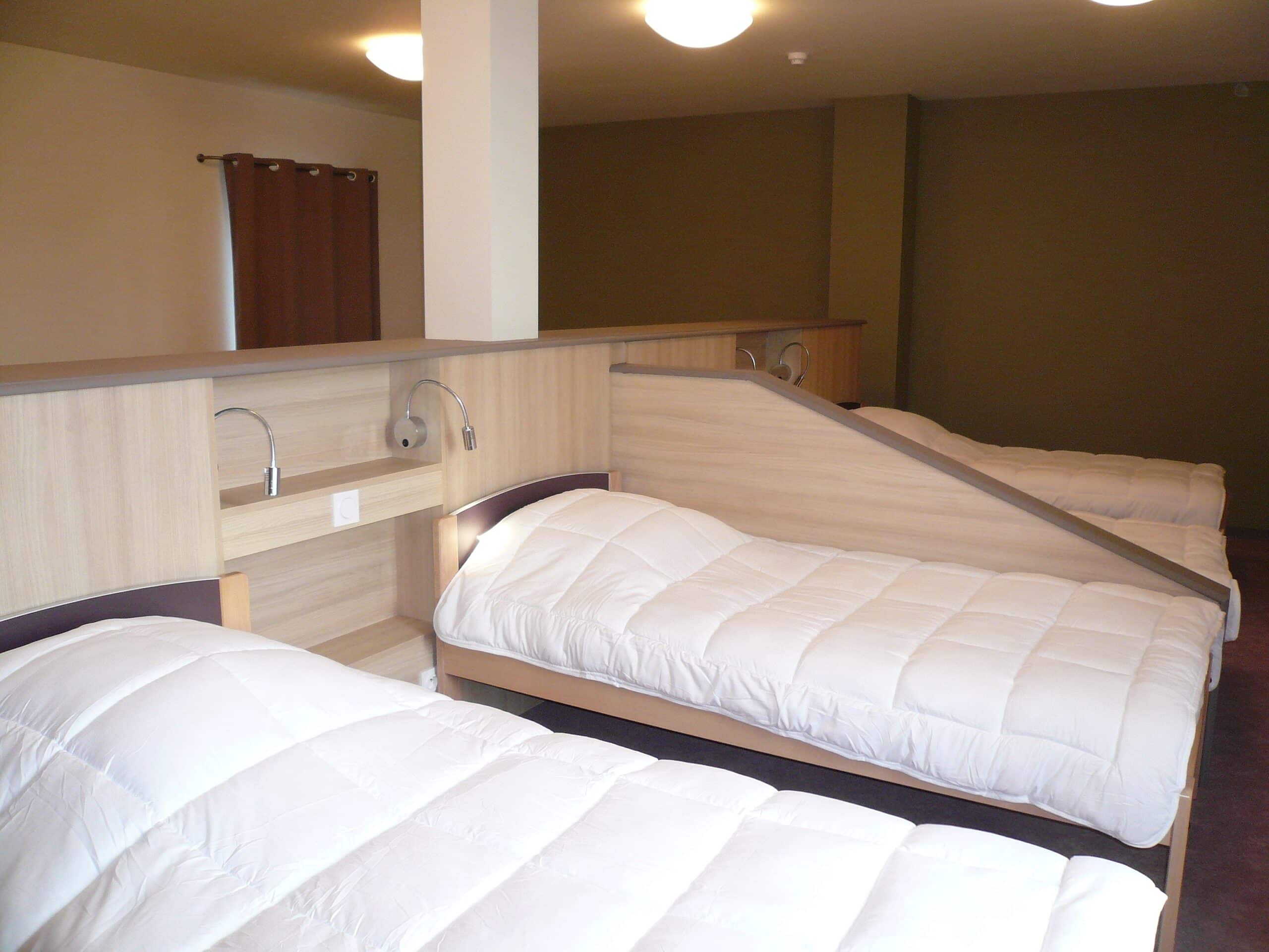 Ce dortoir pour 8 personnes offre le côté convivial de l’hébergement de groupe tout en préservant l’intimité des hôtes par son aménagement. Le couchage est scindé en 4 fois 2 lits et chacun a sa petite veilleuse pour lire sans déranger l’autre…