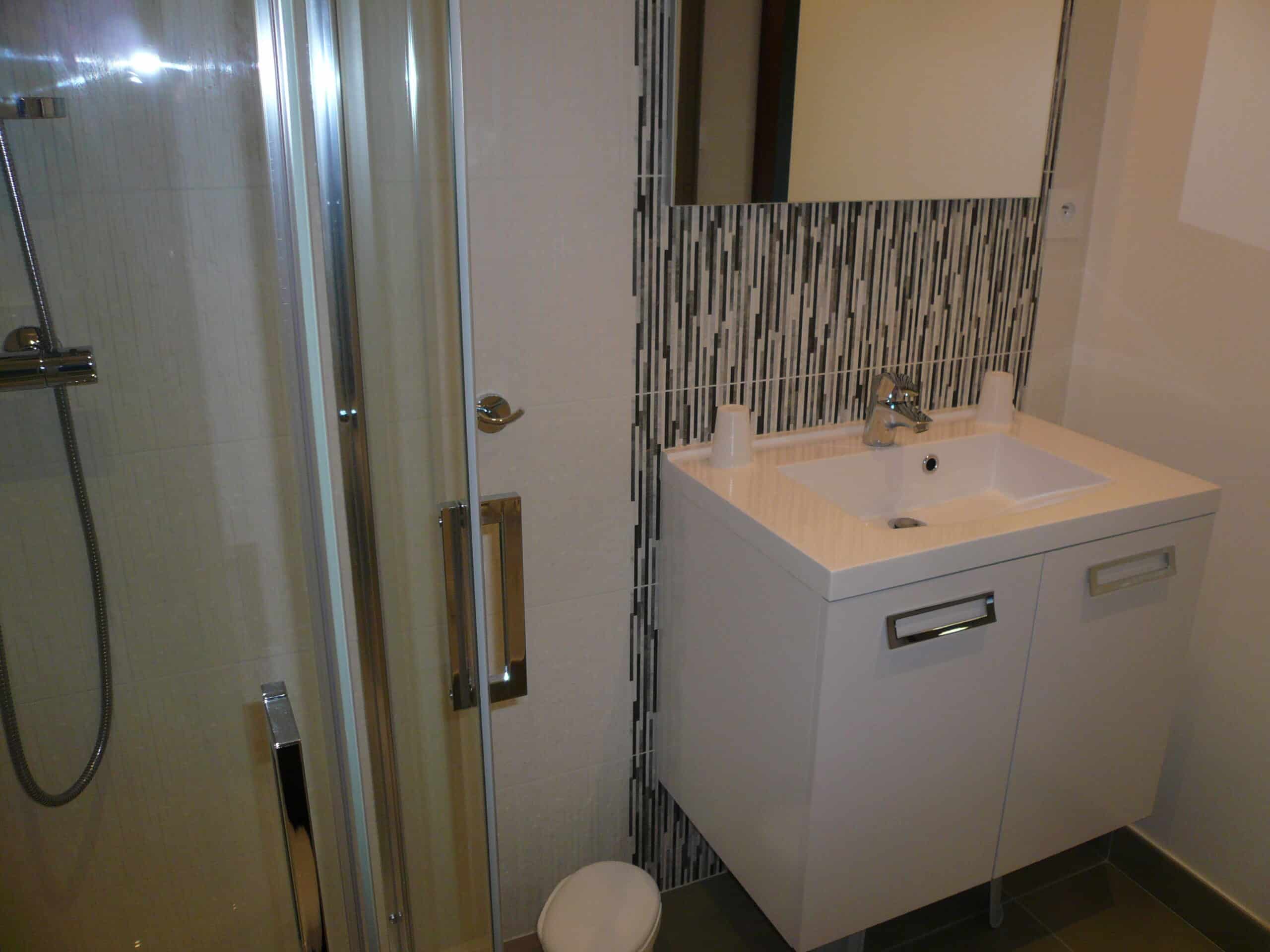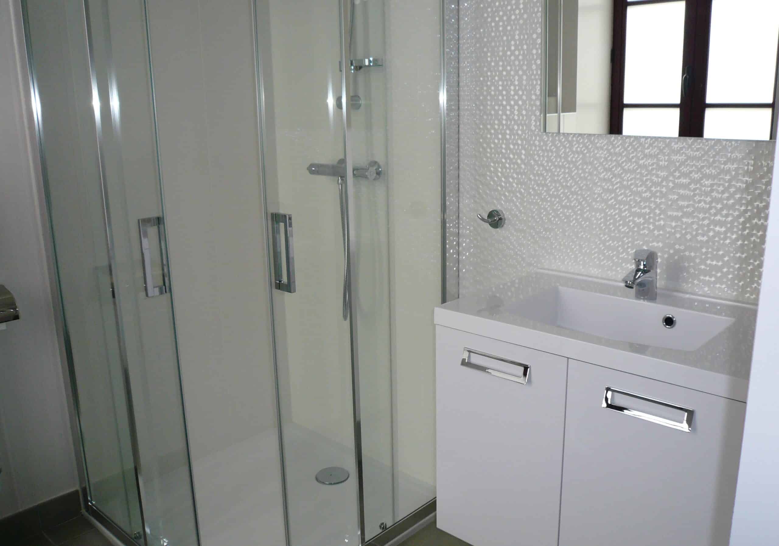 La salle de bain offre un confort moderne et fonctionnel incluant un radiateur sèche-serviettes.